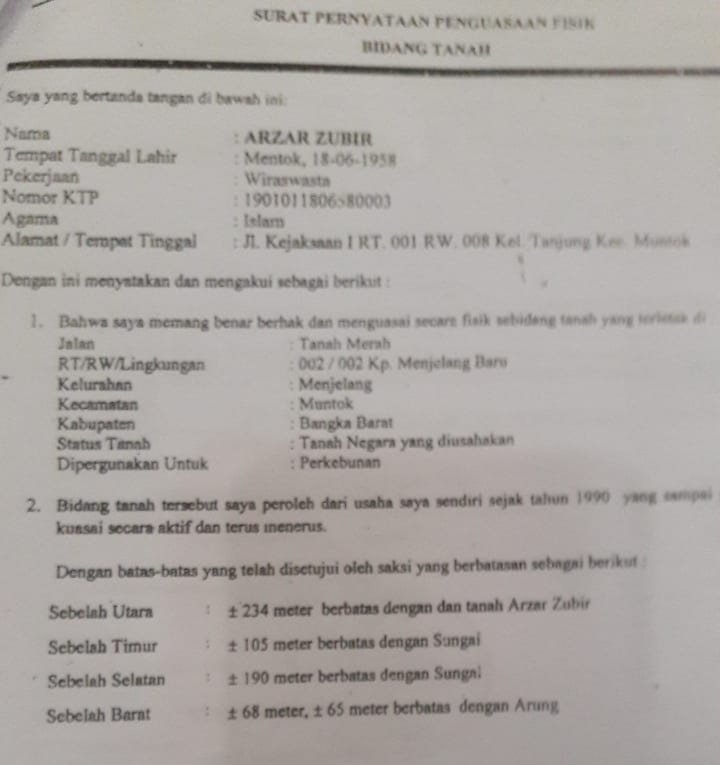 Dalam hal ini Arzar Zubir memiliki surat keterangan fisik hak atas tanah sebanyak 6 surat dengan lokasi sejumlah bidang tanah dimilikinya terletak dalam satu lokasi/kawasan di jalan Tanah Merah, Kp. Menjelang Baru, Kelurahan Menjelang, Kecamatan Muntok, Kabupaten Bangka Barat dengan total luas kurang lebih 12 hektar (ha).