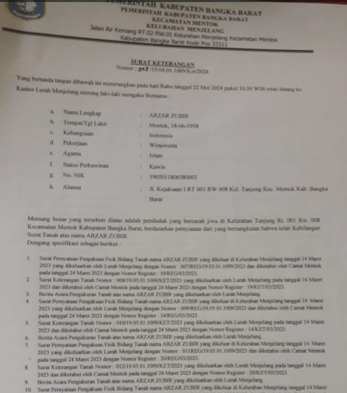 Kehilangan surat tanah ini sudah disampaikan yang bersangkutan (Arzar Zubir) ke pihak Pemerintah Kabupaten Bangka Barat melalui Lurah Menjelang, Mentok pada tanggal 22 Mei 2024, dan pihak Pemkab Bangka Barat mengeluarkan surat keterangan kehilangan surat tanah hak milik Arzar Zubir dengan nomor surat : 017/19.04.01.1009/Ket/2024.