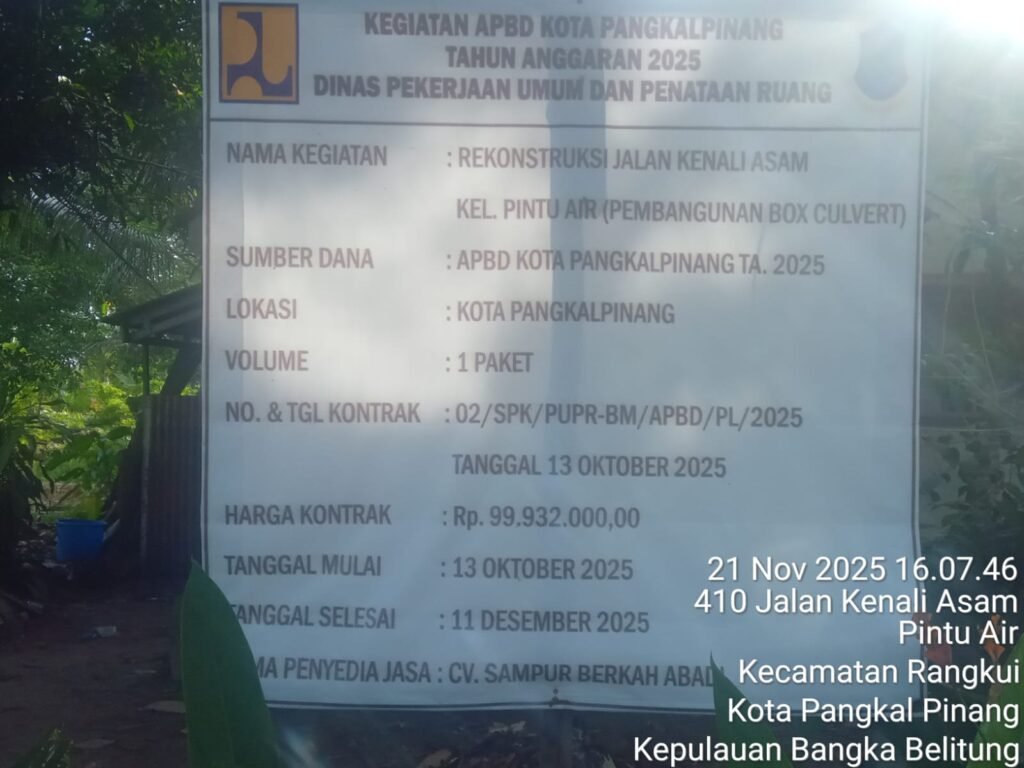 Pangkalpinang ,Indonewstoday.my.id senin/24/11/2025.Proyek perbaikan rekonstruksi jalan Kenali Asam, Kelurahan Pintu Air, berupa pembangunan Box Culvert (PBC) yang menelan anggaran Rp 99.932.000 dari APBD Kota Pangkalpinang tahun 2025, menuai sorotan. Pasalnya, proses pengerjaan proyek tersebut dinilai asal-asalan dan pengerjaannya tidak akan bertahan lama.
